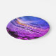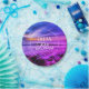 This vibrant, pink and blue Ocean scene, both colourful and calming. "Ocean Bliss" is written in elegant font, across the expansive blue sky and ocean waves. The bright nature scene, also features gentle waves splashing the rocks and calming dash of sunlight at the horizon.