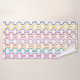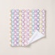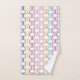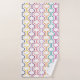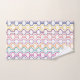 This towel set has an art deco design of orange, turquoise, pink, blue, purple, and yellow half circles connect with lines on a field of white.