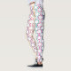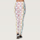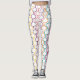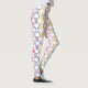 These leggings have an art deco design of orange, turquoise, pink, blue, purple, and yellow half circles connect with lines on a field of white.