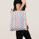 This tote bag has an art deco design of red and purple half circles connect with lines on a field of white.
