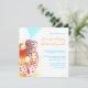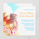 Colourful orchid wedding invitation with turquoise blue and orange text.