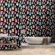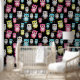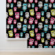 Cute colourful pink, yellow, blue and white kawaii owl birds surface pattern Design On a Black background wall wallpaper