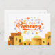 This postcard is adorned with a joyful and colourful design for Passover celebrations. The centerpiece of the layout is the phrase "Happy Passover," rendered in a lively, flowing script that spans the card in shades of warm orange and touches of purple, bringing a festive vibe to the message.