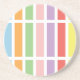 Geometric linear, rectangle, striped pattern of rainbow pastel hues of blue, orange, green, pink, purple, red and yellow.