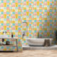 Enhance a baby girl's nursery or bedroom with this charming wallpaper, designed to create a cheerful atmosphere. This vibrant, pastel patchwork wallpaper, featuring a delightful pattern of blue, yellow, and pink, will brighten any space with its playful colours, fostering a joyous environment.