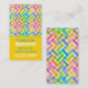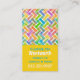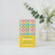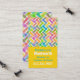 Modern, colourful mummy networking business card, done in a vertical style, with a yellow background. Graphics of colourful layers of a chevron pattern, decorates the top, of the card, with green and white custom text, below, ready to personalise. Great card to hand out to other mothers for arranging baby sitting, play dates, parties and more.