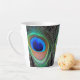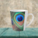 Chill out with a coffee latte in this standard size, latte mug that features the photo image of a colourful peacock feather eyespot pattern. An attractive, trendy design!