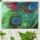 A rainbow of peacock feathers against a green background. The design sparkles to life.