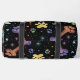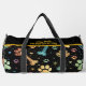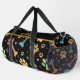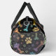 This unique duffle bag features a bold black background adorned with a colourful pattern of coloured paw prints and bones in various vibrant hues. It's a cute design pet accessory and functional travel carrier for any pet lover.