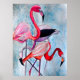 Beautiful colourful watercolor art from original painting by Sacha Grossel of pink and orange flamingos against a sky blue water background. Pretty flamingo art.