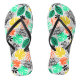 Black flip flops with a colourful tropical plant print pattern and black dots, these are the perfect unique accessory to dress up your outfit for any occasion.