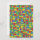 Unique colourful first birthday party invitation. Design features of random colourful plastic blocks on the front and blacks background on the back.