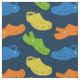 Put your best foot forward as you craft your next sewing project with this fun patterned fabric. The material features illustrations of plastic moccasin shoes in yellow, lime green, orange and bright blue against a navy blue background making it perfect for anyone who prefers a laid back casual lifestyle.