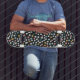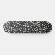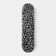 A fun, colourful skateboard design with a polka dot pattern on a black background in pink, grey, green and yellow.