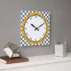 Get playful with this colourful and fancy wall clock! Most of the clock face is white, making the black Roman digits easy to read. The outer parts is where the colourful fun begins! First there is a yellow circle adding a little craziness. Then white polka dots cover the entire border, and you can choose any background colour you like!