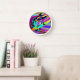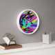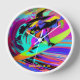 The art style of the image is a vibrant and colourful digital illustration with abstract and surreal elements. It features a colourful witch surfing on a wave, depicted in a dynamic and stylised manner with exaggerated forms and intense, contrasting colours that give it an energetic feel. The use of splashes and swirls in the background adds to the sense of movement and fluidity. It has customisable text 'Magic Rides the Tide.' The resolution is 5984x5984 ppi. If you have any questions about the design, please contact me.