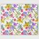 Colourful, pretty flowers with a light pink background. Purple, yellow, and blue flowers with greenery.