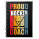 Hockey coach notebook with hockey puck and sticks with colourful stripes and text that reads Proud Hockey Coach.