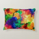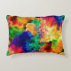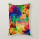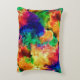 This accent pillow features a colourful psychedelic tie dye style pattern of a rainbow ink painting on a black background.