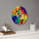 This clock features a colourful psychedelic tie dye style pattern of a rainbow ink painting on a black background.