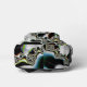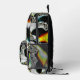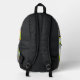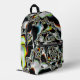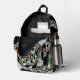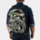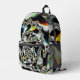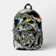 This backpack features an abstract, colourful psychedelic spiral fractal art in black and white with yellow, orange, blue, and green accents.