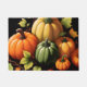 This seasonal botanical artwork features a variety of pumpkins in orange, yellow, and green with some leaves against a black background. Perfect for the fall season!