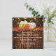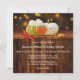 A colourful autumn wedding invitation featuring two pumpkins with fall leaves and bokeh sparkling lights on dark wood. This invitation has a matching RSVP card.