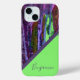 This iPhone 15 case is for marble design lovers. The design has an abstract colourful purple lila marble design with a neon green geometric triangle and purple stripe . A simple and cool design for your personal statement. It is customisable with your name or monogram.