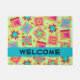 Show your quilt love and welcome guests with this quilt art door mat that's great for home or a quilt business. Customisable word "Welcome" is on a turquoise teal blue strip and can easily be changed to your name or other word. This original quilt art combines favourite quilt blocks such as log cabin, stars and pinwheels plus unique blocks to form a quilt design with vibrant and dynamic colours on a lime green background. The block colours are green, yellow, pink, orange, red, and turquoise blue. Small yellow flowers are in the background between the blocks. This makes a great gift for a quilter or quilt lover. Fully customisable to make it your own. This original quilt art is from fabric and quilt designer Phyllis Dobbs.