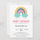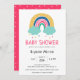 Cute illustrated colourful rainbow, baby shower invitation. Template allows all text to be customised. Back of card features coordinating pink and white doodle pattern.