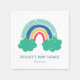 Cute colourful illustrated rainbow, personalised paper napkins. Colourful abstract doodle rainbow, clouds and stars. Template provides two lines for your custom text in coordinating blue colour.