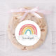 Colourful Rainbow Calligraphy Kids Birthday Classic Round Sticker features a hand drawn rainbow in shades of pink, orange, yellow and turquoise and a trendy calligraphy name. The back is blank for your hand written message.