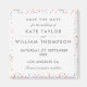 Colourful rainbow confetti sits above your special save the date details set in stylish elegant modern typography. Designed by Thisisnotme©