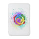 Large, blooming rose with rainbow petals on white background, painted over with splashes of colourful, bright paint. 3d