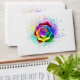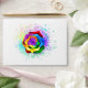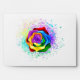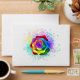 Large, blooming rose with rainbow petals on white background, painted over with splashes of colourful, bright paint. 3d