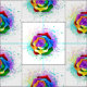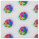 Large, blooming rose with rainbow petals on white background, painted over with splashes of colourful, bright paint. 3d