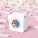 Large, blooming rose with rainbow petals on white background, painted over with splashes of colourful, bright paint. 3d