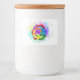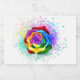 Large, blooming rose with rainbow petals on white background, painted over with splashes of colourful, bright paint. 3d
