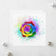 Large, blooming rose with rainbow petals on white background, painted over with splashes of colourful, bright paint. 3d
