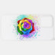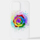 Large, blooming rose with rainbow petals on white background, painted over with splashes of colourful, bright paint. 3d