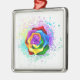 Large, blooming rose with rainbow petals on white background, painted over with splashes of colourful, bright paint. 3d