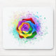 Large, blooming rose with rainbow petals on white background, painted over with splashes of colourful, bright paint. 3d