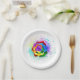 Large, blooming rose with rainbow petals on white background, painted over with splashes of colourful, bright paint. 3d