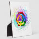 Large, blooming rose with rainbow petals on white background, painted over with splashes of colourful, bright paint. 3d