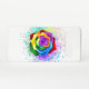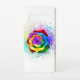Large, blooming rose with rainbow petals on white background, painted over with splashes of colourful, bright paint. 3d