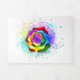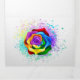 Large, blooming rose with rainbow petals on white background, painted over with splashes of colourful, bright paint. 3d