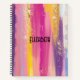 A personalised spiral notebook with an abstract background design. Vibrant stripes in both bold and pastel colours. Pinks, blues, purples and yellow colours combined with faux gold sparkly glitter layered over top.
