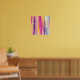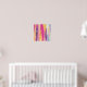 Poster with an abstract background design. Vibrant stripes in both bold and pastel colours. Pinks, blues, purples and yellow colours combined with faux gold sparkly glitter layered over top.