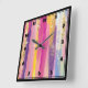 A clock with an abstract background design. Vibrant stripes in both bold and pastel colours. Pinks, blues, purples and yellow colours combined with faux gold sparkly glitter layered over top.