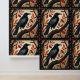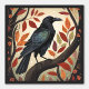 A cute and colourful folk art rendition of a raven (Corvus corax) perched in a tree, the colours of the leaves evoke a feeling of Autumn.